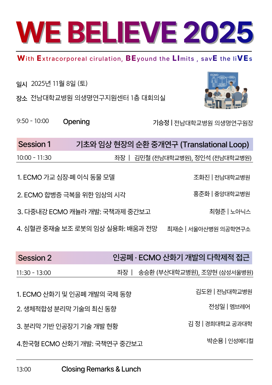 WE BELIEVE Annual Research Meeting 환자 치료에서 연구로, 연구에서 다시 환자로 연결되는 다학제 협력의 장 행사 개요 중증 심폐부전 환자 치료와 ECMO·인공폐·중환자 치료 혁신을 주제로, 임상의–공학자–산업체가 함께 토론하는 연례 연구 모임입니다. 실제 임상 문제를 연구 과제로 전환하고, 연구 성과를 다시 환자 치료에 적용하는 translational research의 선순환을 목표로 합니다. 위치 및 장소 장소 전남대학교병원 의생명연구지원센터1층 대회의실 주소 광주광역시 동구 백서로 160