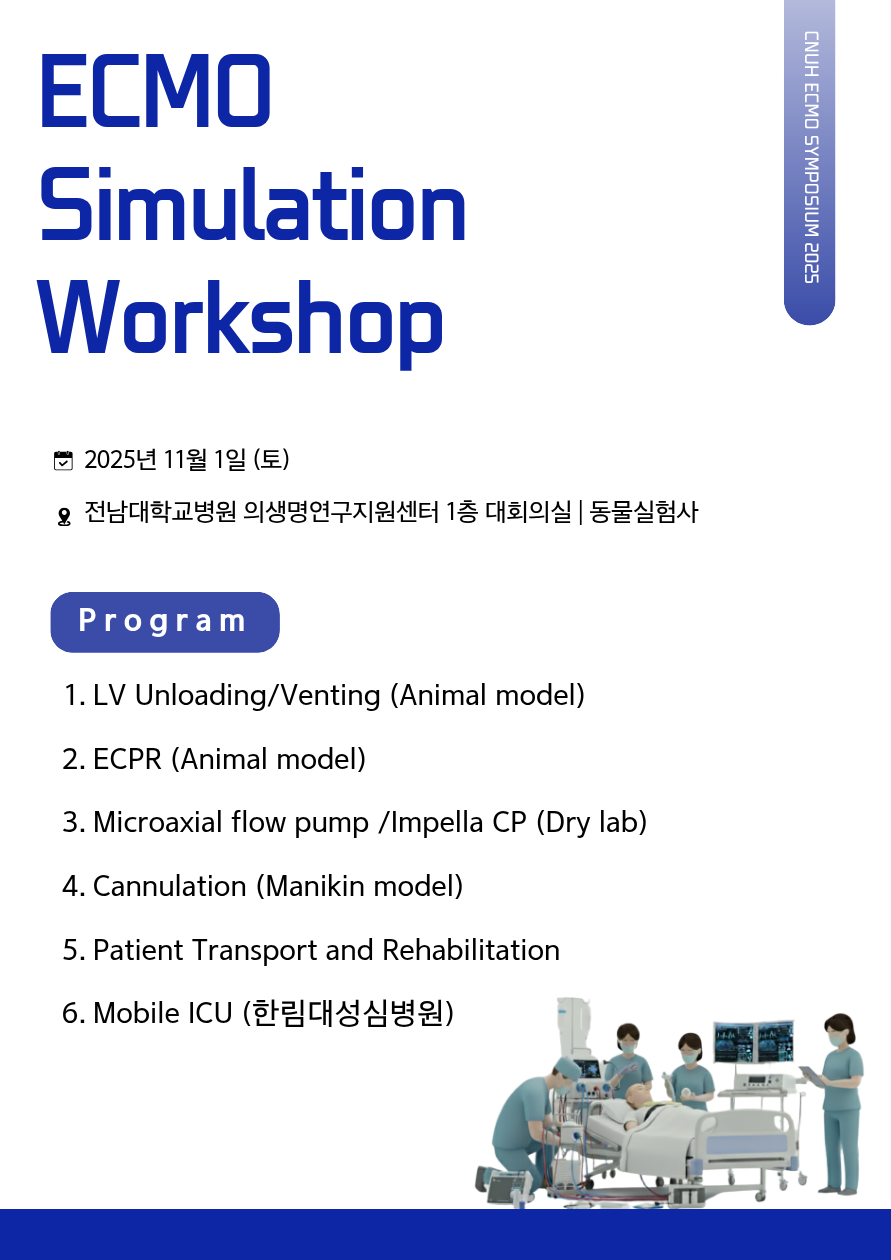 Overview Program Registration Venue Simulation workshop Hands-on ECMO Training with Simulation and Animal Model 본 워크숍은 시뮬레이션과 동물모델을 통한 실제 ECMO 운영 교육을 제공합니다. 프로그램 안내 등록하기 위치 및 장소 장소 전남대학교병원 의생명연구지원센터1층 대회의실동물실험사 주소 광주광역시 동구 백서로 160